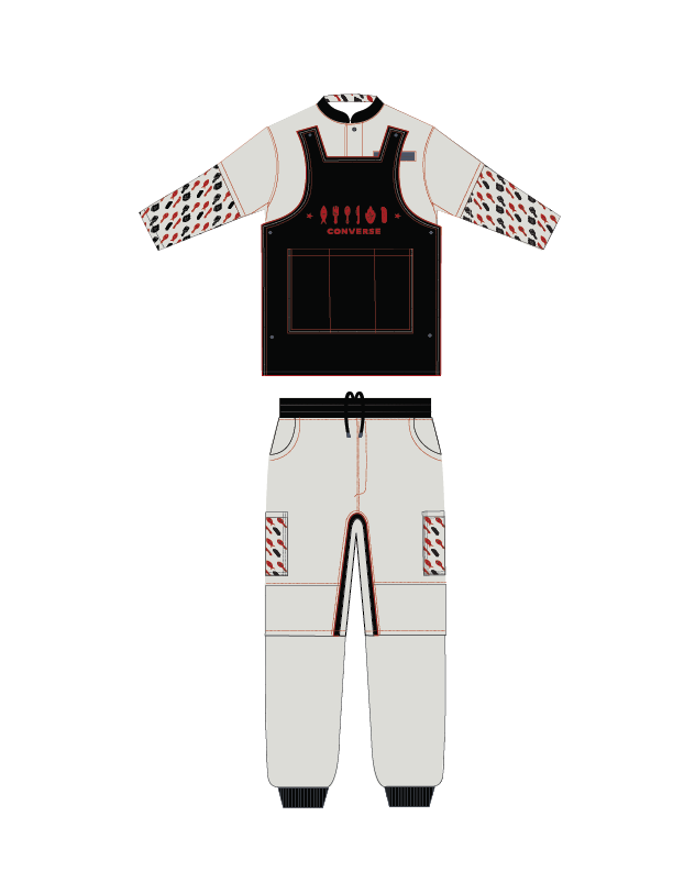 Inspired by the concept of “athletes of the kitchen,” this performance-driven chef uniform reimagines culinary professionals as high-performing athletes, merging Converse’s sport heritage with functional workwear design. The apparel design process focused on concept development, silhouette exploration, and functional detailing to support mobility, comfort, and durability in a fast-paced kitchen environment. Collaboration with the graphic designer ensured cohesive integration of Converse’s visual identity and branding elements, while partnership with the color and materials designer refined the color palette and performance-driven fabric selection. The final design balanced Converse’s athletic legacy with modern, practical culinary functionality.